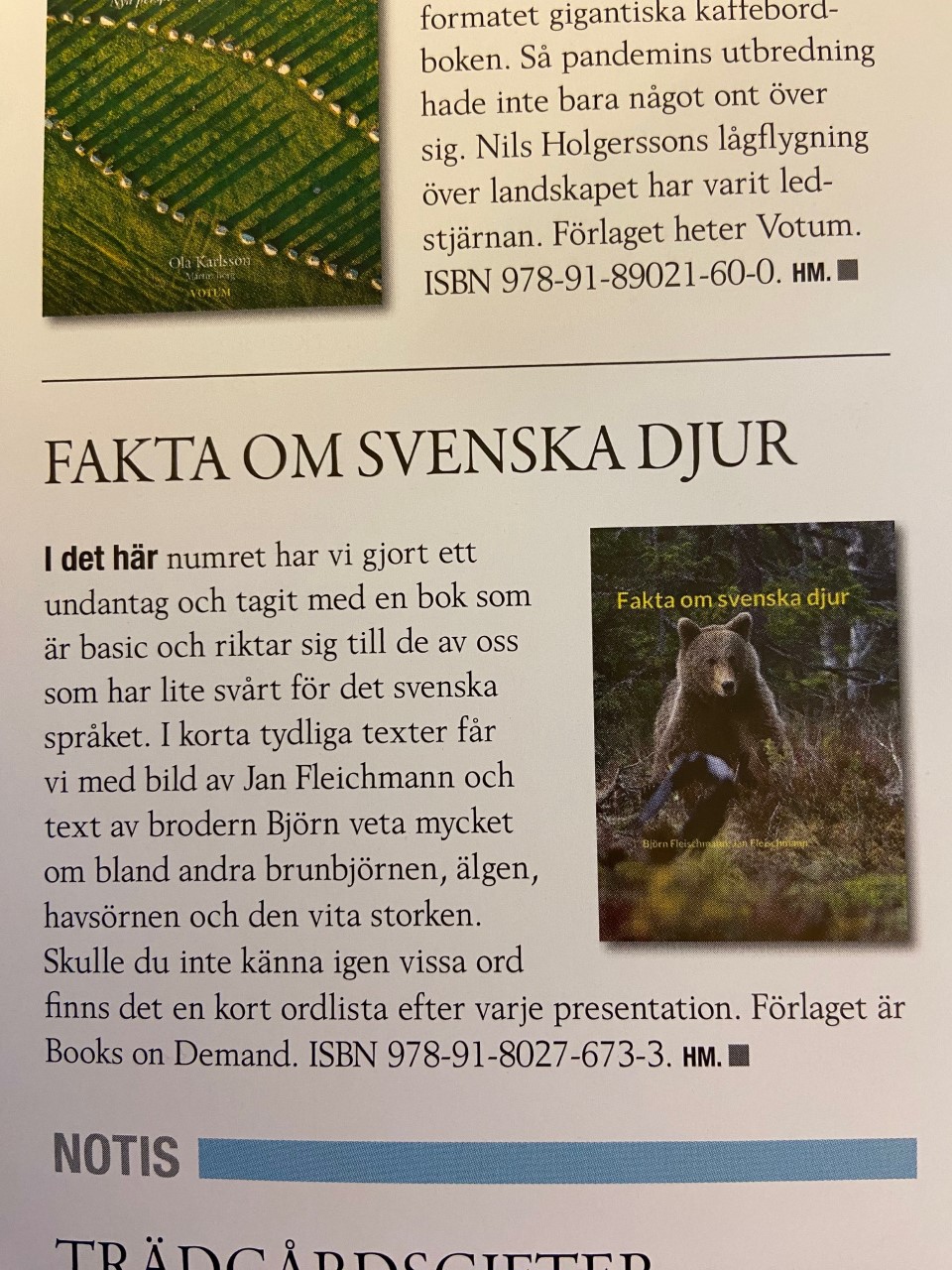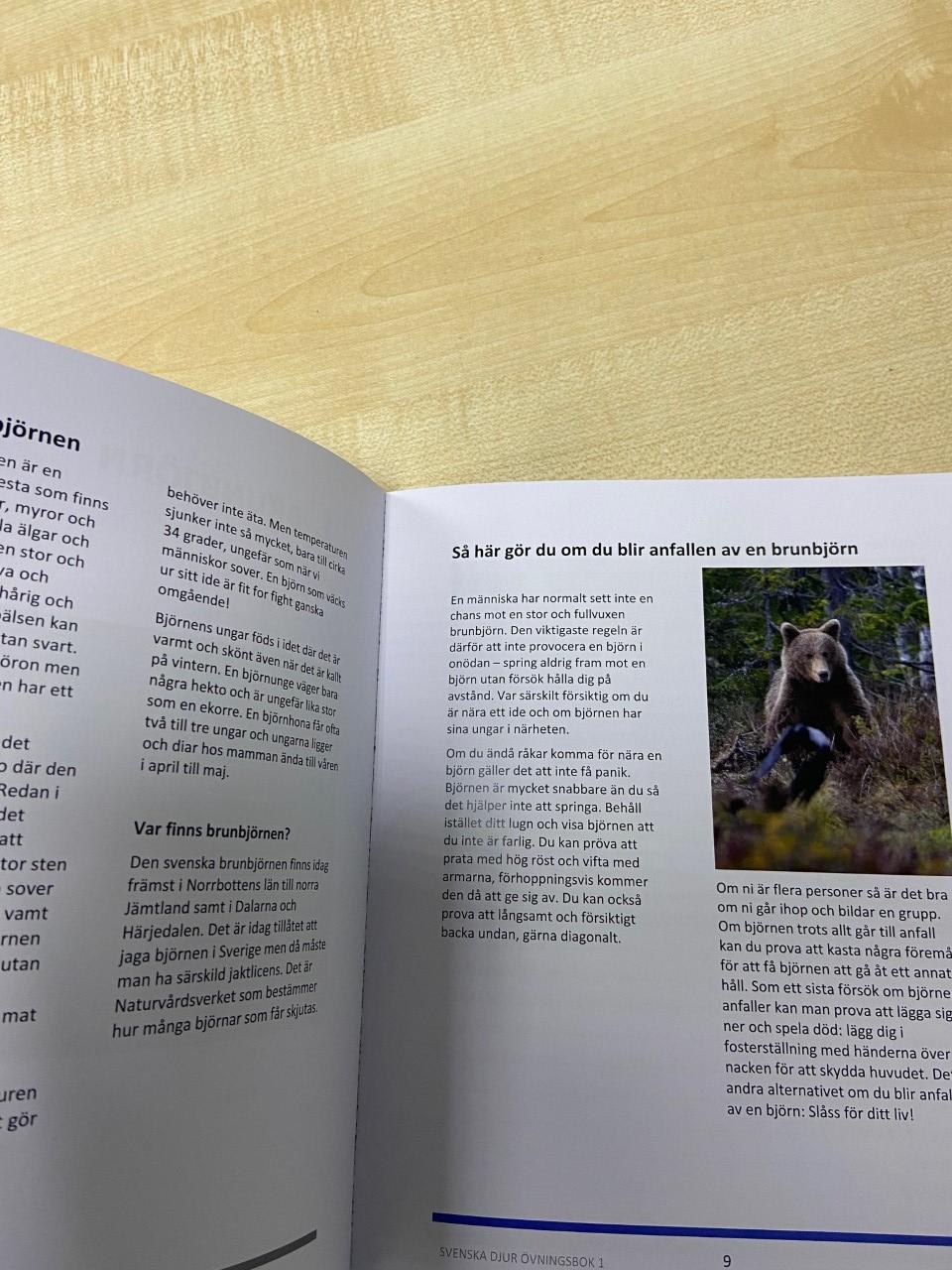 Man måste inte åka jorden runt för att få spännande naturupplevelser. I den här boken får du möta många av våra fantastiska svenska vilda djur som brunbjörnen, älgen, vargen och många andra djur. Boken är framtagen för att passa i skolan med lättlästa faktatexter.